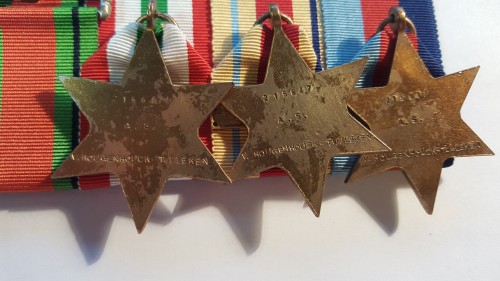 A full-size set of WW2 medals named to Pte A.S. van Hougehouck-Tulleken (Number: 215647). Court mounted for display.