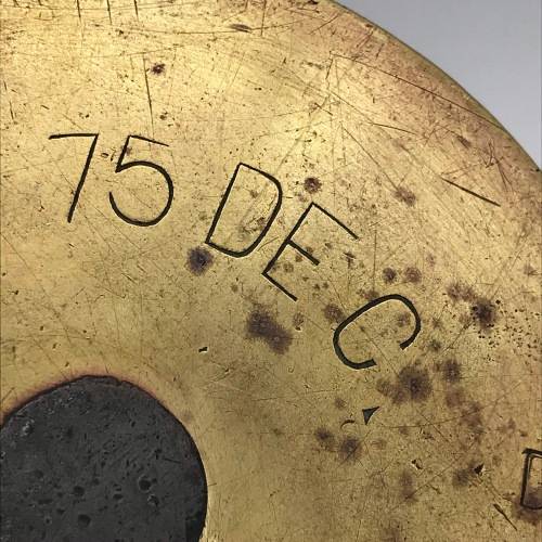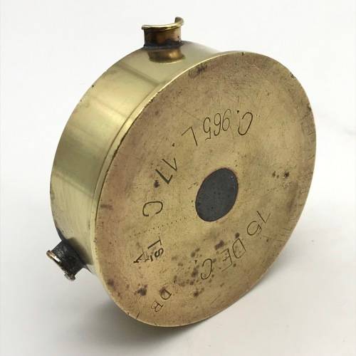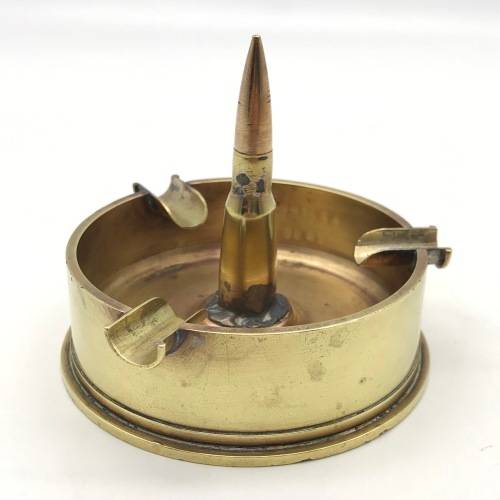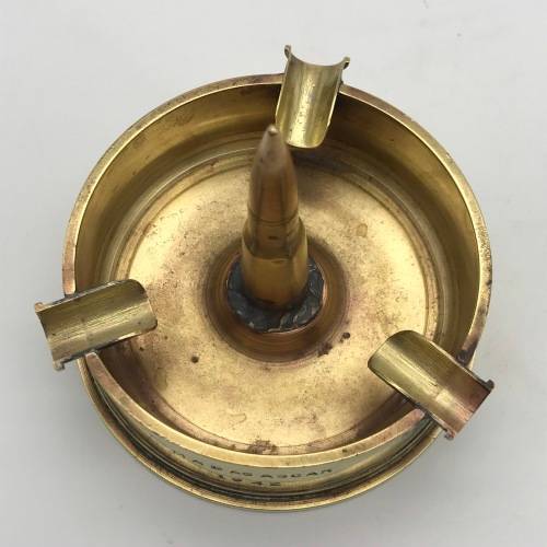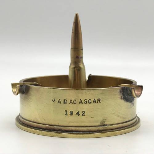 This early, heavy 'Prisoner of War or Trench Art' ashtray has been hand-crafted out of a brass shell and bullet casings and is stamped on the side 'MADAGASCAR 1942'. There's a few markings and numbers on the base of the ashtray/shell that read 'C. 965 L. 17 C, TS, DB, 75DE C'. The ashtray measures 8,5cm, stands 7,2cm and weighs 470g.