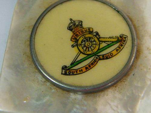 WW2 SA Field artillery sweetheart fob on mother of pearl backing