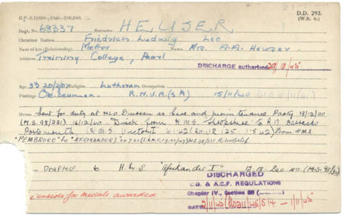 WW 2 SA Navy medal group - correctly inscribed to 68337 Seaman F.L.L. Heuser. Court mounted for display. He serves in WW2 out of Durban to Portsmouth (UK). Records that I have will be included. All medals are confirmed in his records.