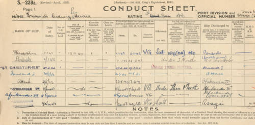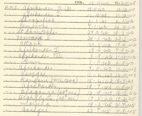 His service card showing deployment to UK - Portsmouth and the ships served.