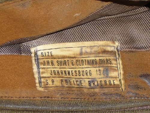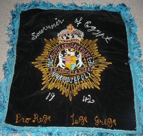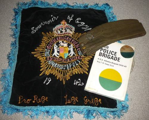 SA POLICE BRIGADE LOT which includes a officer issue side cap with label for the POLICE BRIGADE..The book THE POLICE BRIGADE.Original 2 SAI badge and Egyptian souvenier with the Brigades badge on it 1942.Rare lot