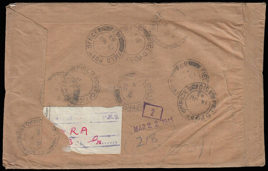 WWII 1943 registered letter from Kodak Egypt in Cairo to a member of the M.E. Forces, redirected various times with nine Field Post Offices strikes on reverse.
