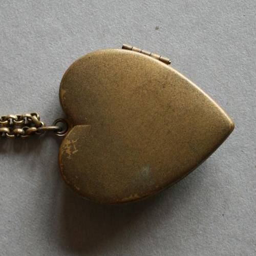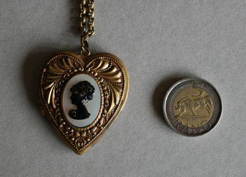 This is a true 1940's beauty. I'm not sure of the metal type, but it is gold in colour and beautifully detailed. The cameo is mounted on a mother of pearl inlay. The pendant, hinge and chain is in good working condition, except for some paint loss due to wear. The interior still has the original paper and cellophane inlay. The chain measures 45cm in length. See the images below for details pertaining to condition and size.