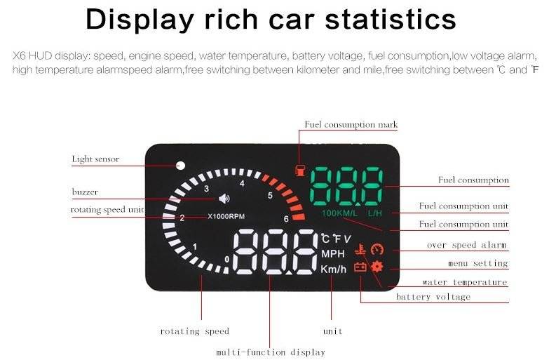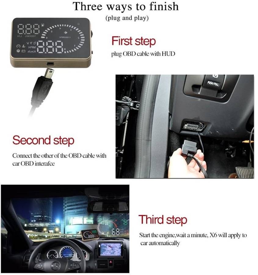 X6 HD LED Car HUD Head up Display Projector, OBDII Interface, Show Speed, Fuel Consumption, Temp....