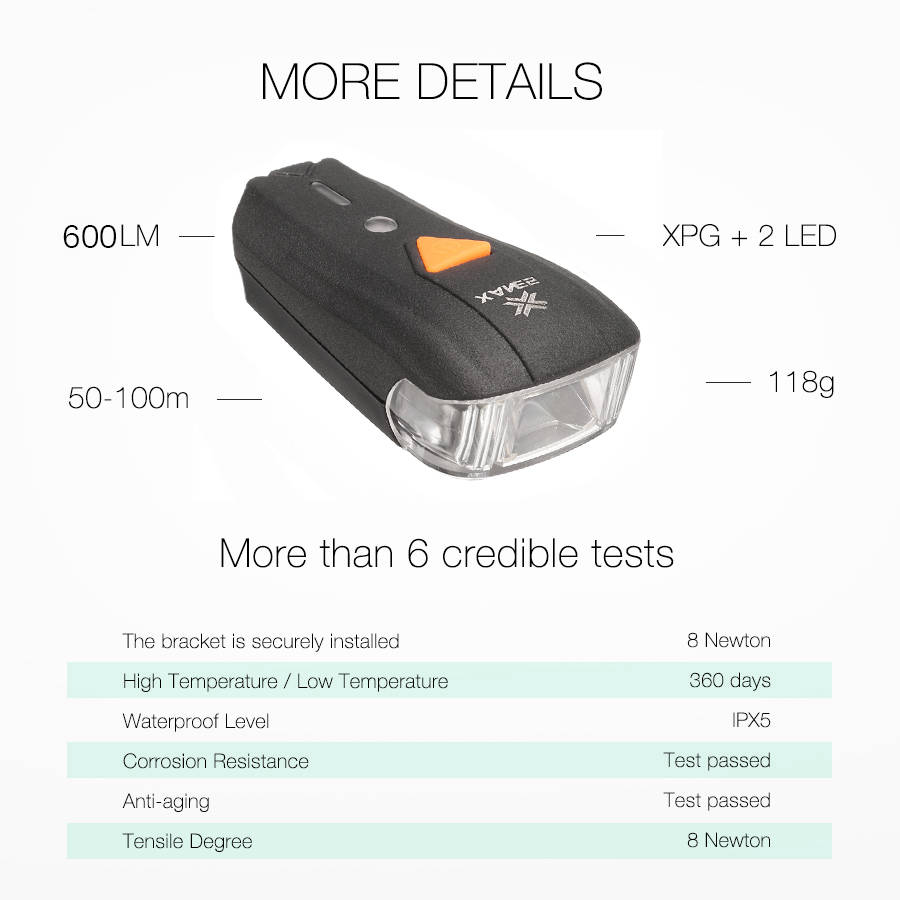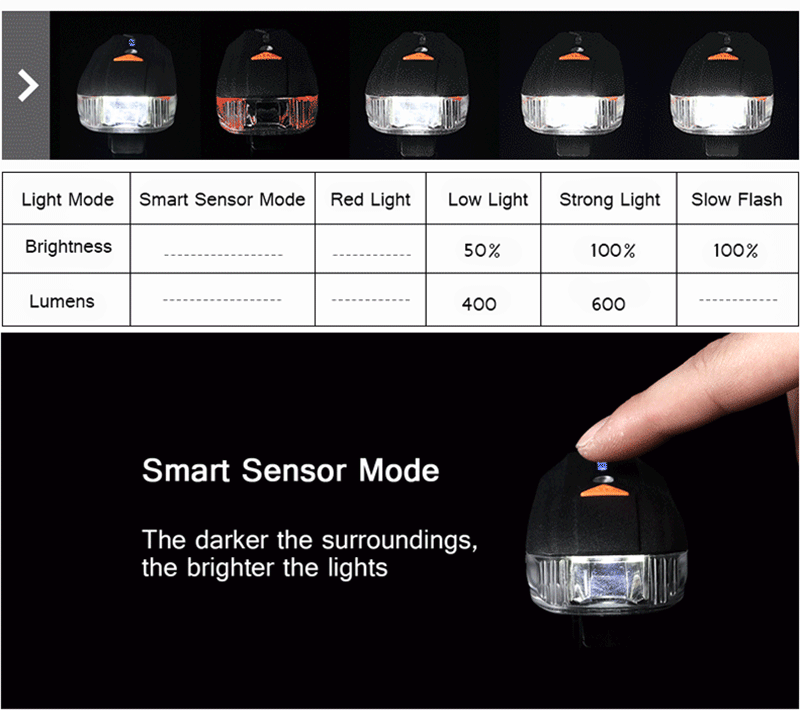 | 5 Modes | 1 - Smart Sensor Mode 2 - Red Light 3 - Power Saving Light + Day Light (400LM) 4 - Strong Light + Day Light (600LM) 5 - Slow Flash |