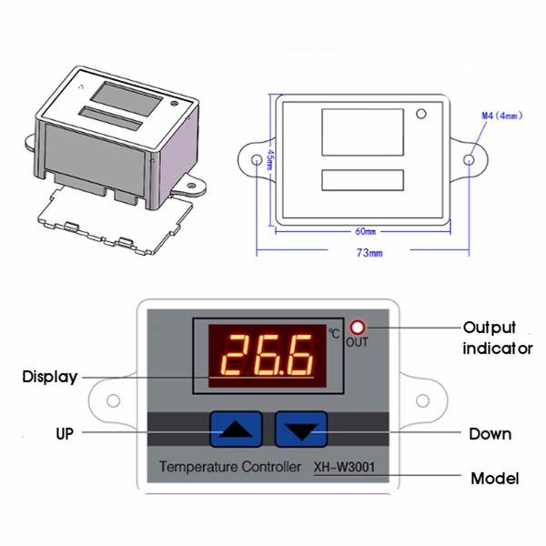 Package weight: 0.06 kg Features: Model: XH-W3001 Name: Temperature Controller 1. Temperature measurement, display, refrigeration, heating control. 2. Temperature setting upper and lower limits. 3. Simple operation, suitable for seafood machines. 4. Easy to install. Specification: 1. Measurement range: - 50°C - 110°C 2. Control range: - 50°C - 110°C 3. Measuring accuracy: plus or minus 0.2 °C 4. Control precision: plus or minus 0.1 °C 5. Measuring input: NTC10K L= 1 m waterproof probe 6. Power: 1500W 7. Input voltagr: 220V 8. Current: Max 10A 9. Size: 60 x 45 x 30mm How to use: 1. Press the up button show the starting temperature long press UP button the temperature display Flashing , press the UP or Down button Set the start temperature value. 2. Press the Down button show the Stop temperature long press Down button the temperature display Flashing , press the UP or Down button Set the stop temperature value. Package included: