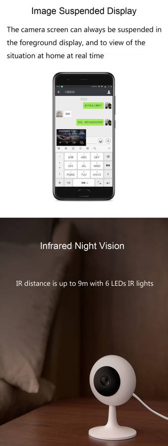 Floating windows of the APP, convenient for watching Support max.64G micro SD card ( not included ), also support NAS cloud storage Support night vision, IR distance is up to 9m with 6 LEDs IR lights Support WiFi connection, realize 10m remote control