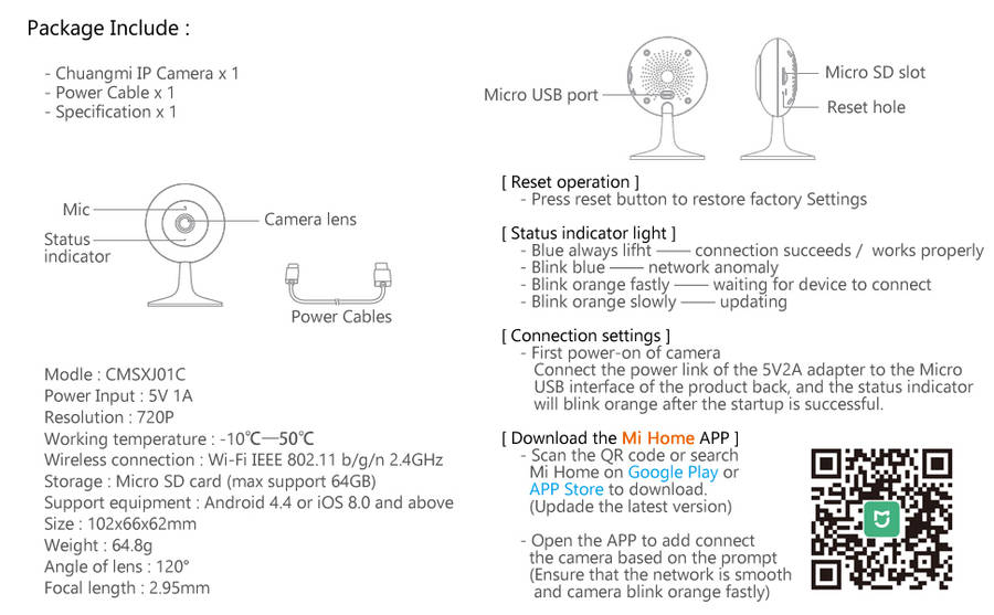 1 x Xiaomi Chuangmi IP Camera 1 x User Manual 1 x Power Line 1 x Sticker