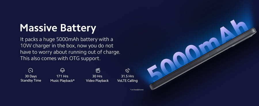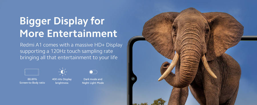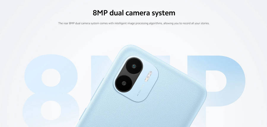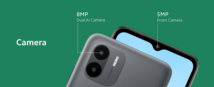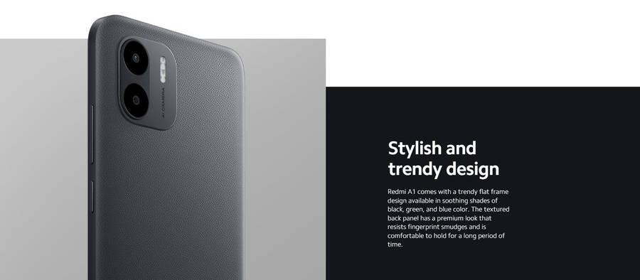 Redmi A1 comes with a trendy flat frame design available in soothing shades of black, green, and blue color. The textured back panel has a premium look that resists fingerprint smudges and is comfortable to hold for an extended period of time.