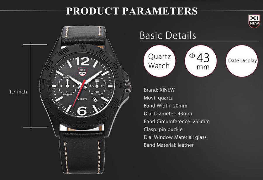 - Quartz movement gives you precise time - The date display saves you from the trouble of forgetting any important day - Luminous pointer helps you get precise time even in the darkness - Smooth leather band, comfortable to touch and durable in use - Two decorative sub-dials add a little fun to the whole design - Pin buckle, easy and convenient to wear