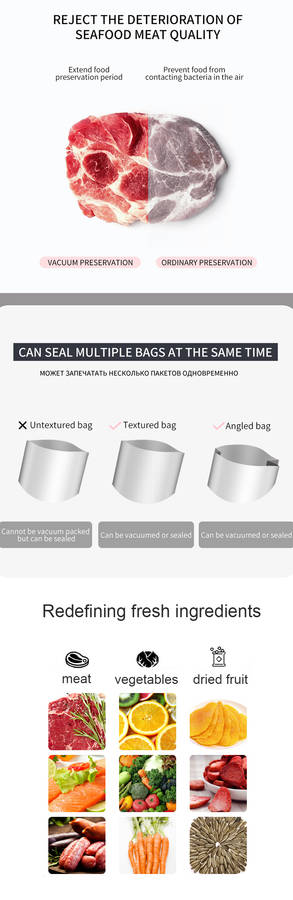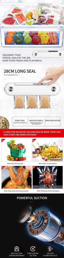 Description : 1. (Keep Food Fresh Up to 7x Longer) Food Vacuum Sealer quickly removes air from heat-seal bags to reduces spoilage and food waste, keeps them fresh for weeks, perfect food saver for meat, cheese, vegetables, fruits, herbs and marinated food. And cooking and meal preparation will become easier, more economical and faster.? 2. (Healthier and More Convenient Uses ) With vacuum sealer, You bulk-buying and sealing become a far more cost-effective way of life; you can make dishes in advance, seal, freeze, and then finish day-of; Marinating Something Quickly; Resealing Snacks Packaging to keeps foods and snacks fresh and flavorful . 3. (Two Sealing Modes and One-Contact Operation) A smart device at your family's service. Food Vacuum Sealer is designed with dry and moist sealing modes to provide your food with best possible preservation based on your different types of food. Simply press the 'Vacuum Seal' or 'Single Seal' button to automatically seal your food. Also easy for cleaning after use.? 4. (Compact size and Lightweight Design) Food Vacuum Sealer is with slim design, beautiful curved lines. Removable power cable easy for organization once you are done using it. It can easily placed in a kitchen drawer or cabinet.? ? Features : 1. Keep food fresh for longer? 2. Moisture-proof and mold-proof? 3. Sterilizating and disinfecting? 4. Antioxygenation? 5. Prevent deterioration? ? Specification : colour: pink / white? Material: ABS+PP? size: 357 x 54.5 x 79.5mm voltage: 220V ? Package includeds : 1 x Vacuum Sealer? 1 x User manual? 1 x Power Adapter(Corresponding Adapter?) ? Details pictures :