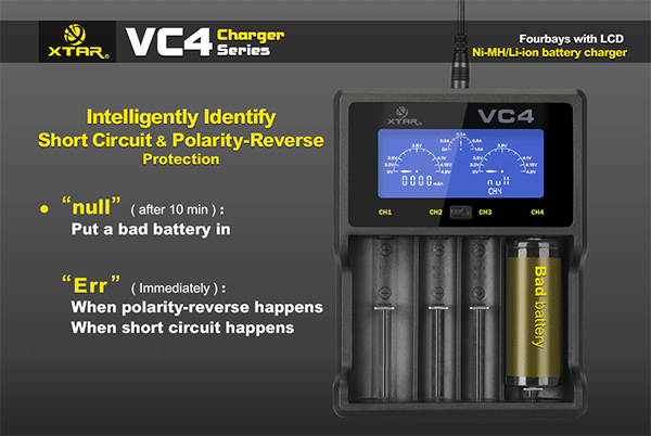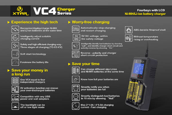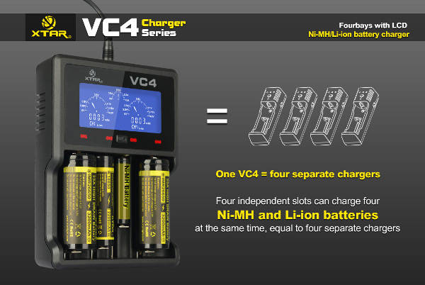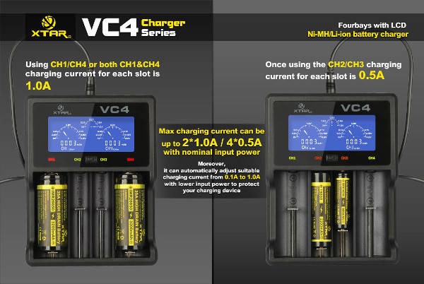 Package weight: 0.22 kgDescription:XTAR VC4 is not only the upgraded version of both VC2 and XP4c chargers, but also the combination of our principle to keep making progress and taking the responsibility for the safety and environment protection. The VC4 can recognize/ display/ charge Ni-MH and Li-ion batteries at the same time and it also displays the charging current, battery voltage and charging capacity. The LCD backlight can be off or automatically into low light mode in 2min to save more energy.