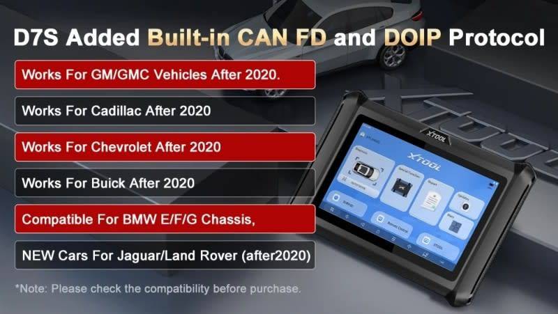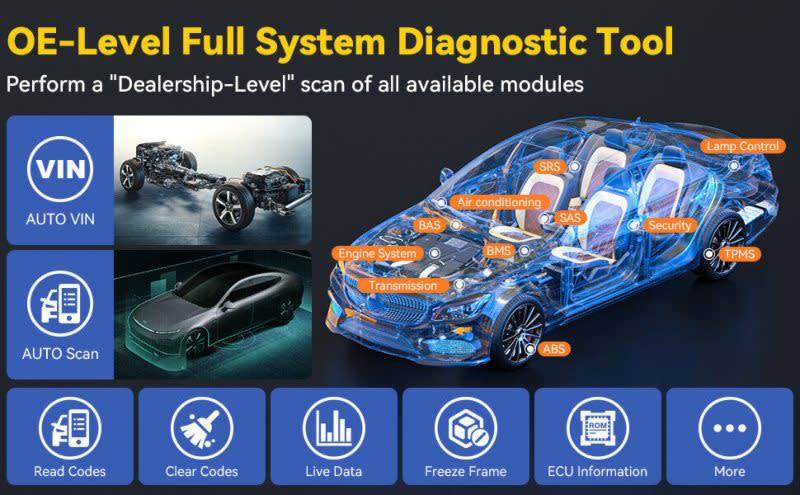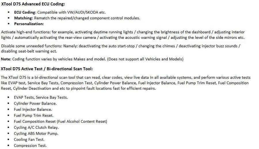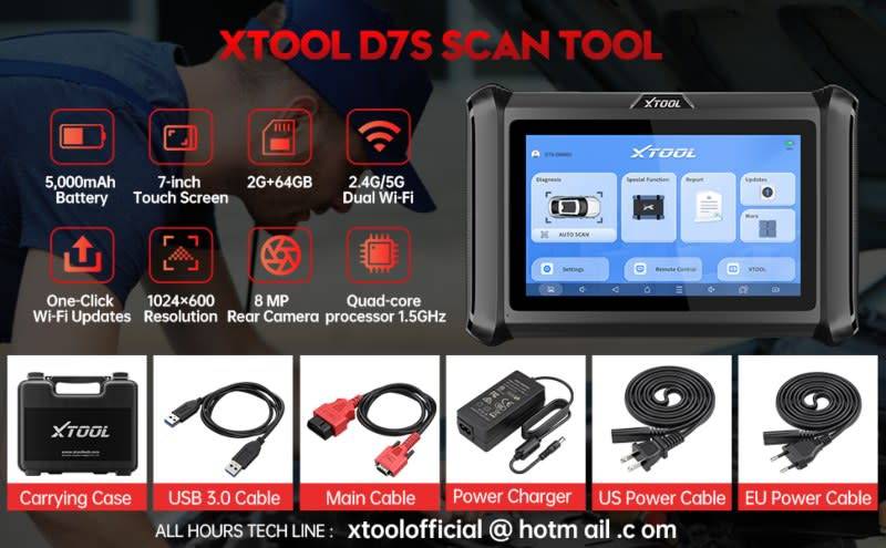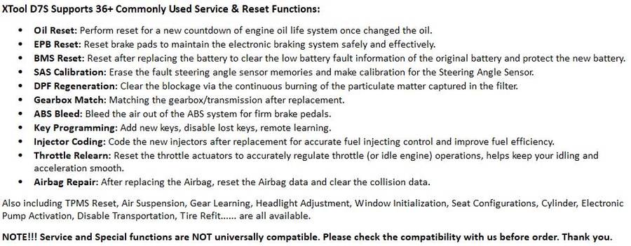 The XTool D7S supports full-system vehicle diagnosis, including reading ECU version information, reading fault codes, real-time data and freeze frames. Supports 36+ common special functions Namely: throttle matching, ABS bleeding, maintenance light reset, EPB test, SAS, BMS, injector coding, DPF regeneration, TPMS reset, etc. 98% vehicle coverage.