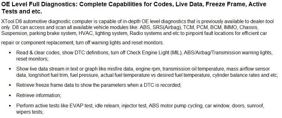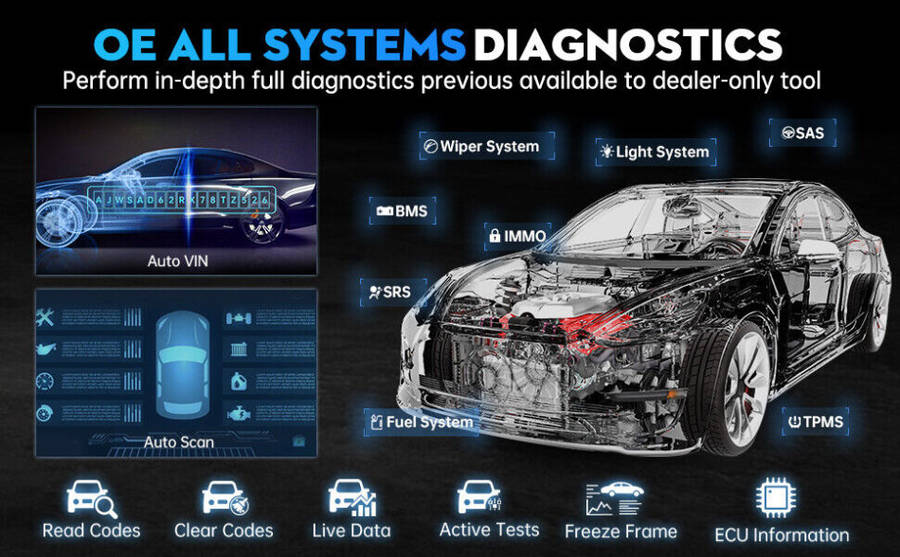 - OE-Level Full System Diagnostics: Complete capabilities for codes, live data, freeze frame, active tests and etc on all available systems.