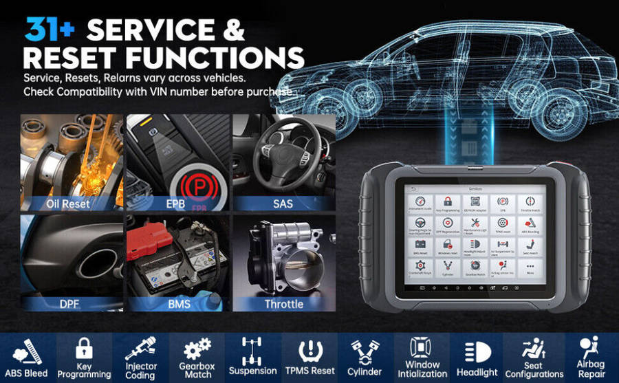 Other special functions includes: Throttle Relearn, Suspension Calibration, Trans Adaptation(Gearbox Match), TPMS Reset, ABS Initialization, Seat Calibrations, Zero Point Calibration(of yaw rate sensor/seat weight sensor, etc), Window/Door/Sunroof, Headlight Adjustment, Airbag Reset(airbag reset and clear airbag crash data), Idle Relearn, Power Balance, Transport Mode, Tire Upgrade, Tooth Learning, VGT Learn(VGT Turbo Calibration), Fuel Trim Reset, Fuel Alcohol Composition Reset, Air/Fuel Reset, Start/Stop Reset, Language Change, and continuously growing.