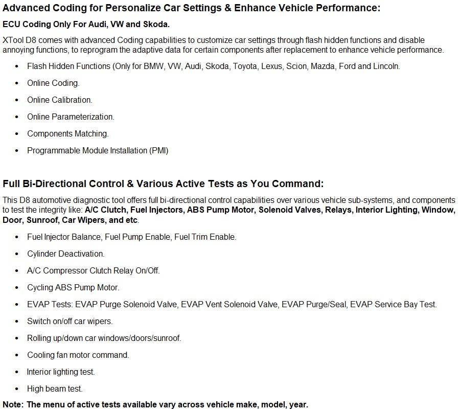 - Advanced Coding: Re-flash the Hidden Functions for personalization, Components Matching after making repairs or replacements, Reinforce Vehicle Performance, etc.