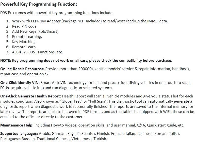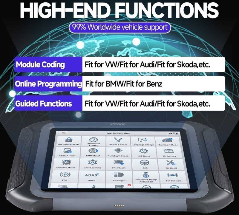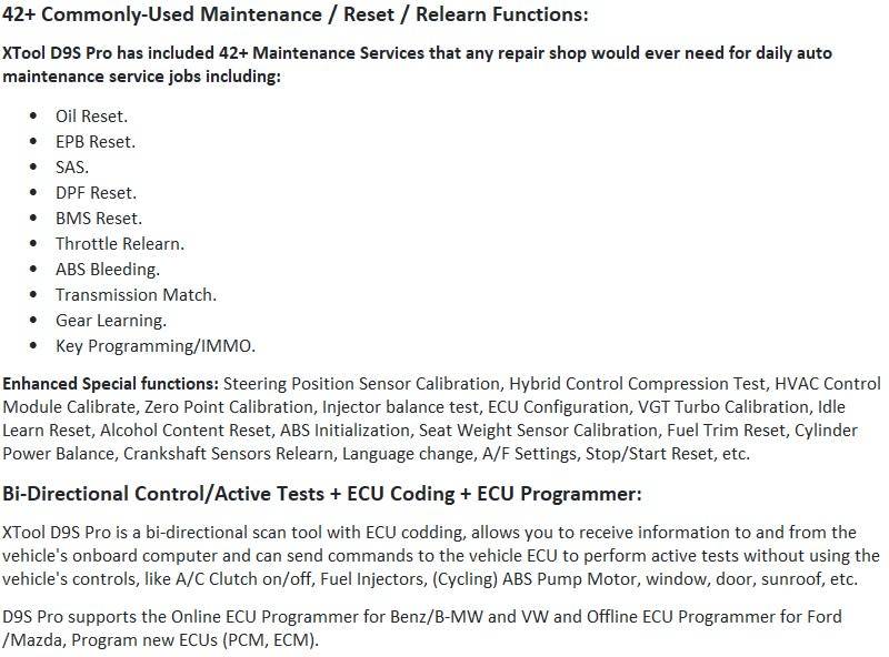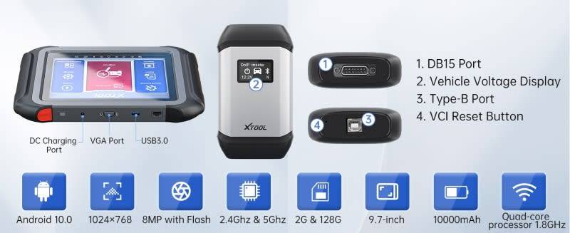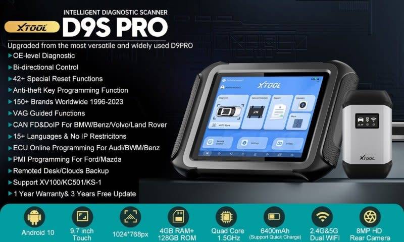 XTool D9S Pro is an advanced automotive diagnostic system featuring a large 9.7-inch screen and dual WIFI modules for stable data transfer between the tablet and VCI. Designed for mechanics, electricians and automotive repair stores, it provides full-system automotive diagnostics, live data, Bi-directional control test, ECU coding and ECU programming. D9S Pro also supports 42 common special functions namely: Throttle adaptation, ABS bleeding, Service light reset, EPB test, SAS calibration, BMS reset, Injector coding, DPF regeneration, and TPMS reset. With 98% vehicle coverage and compatibility with over 100 brands and 10,000 car models.