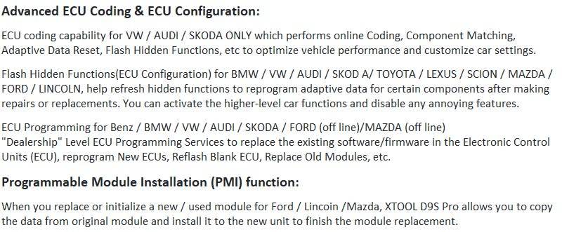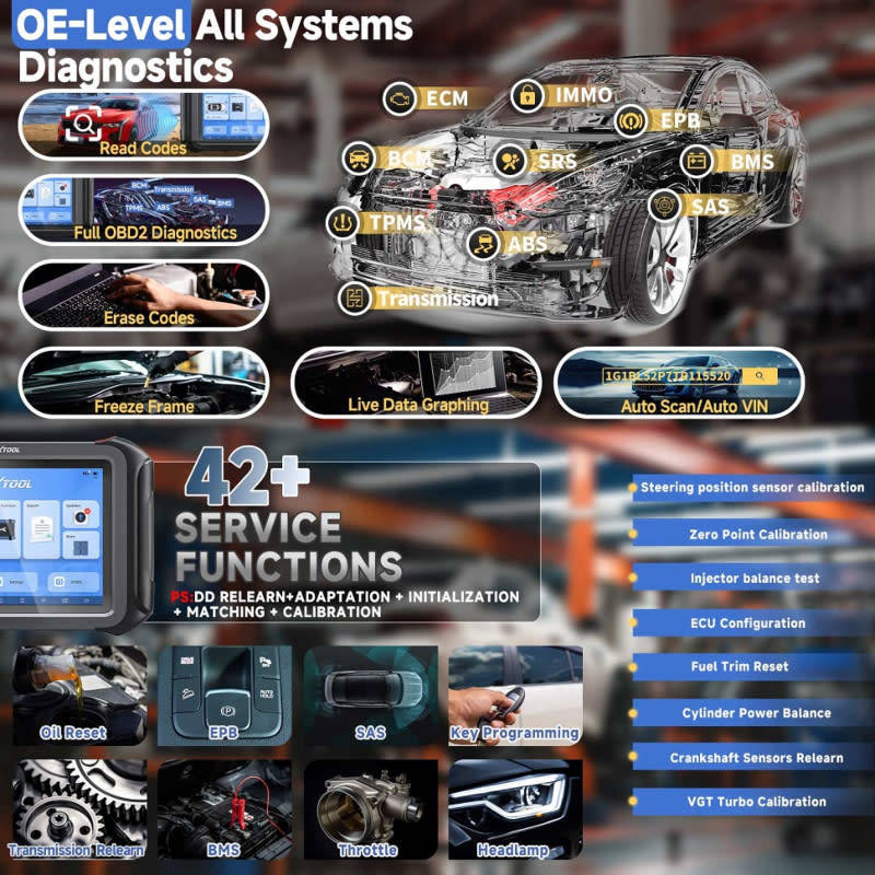 XTool D9S Pro is an OE-level full diagnostic scanner as it can scan ECUs in different types of vehicle systems and subsystems namely: Engine, TCM(Transmission), SRS(Airbag), ABS, TPMS, BCM, BODY, AC and much more, read /clear codes, view the live data from each available system, perform active tests to check the work status of modules, providing you with a dealership- level only diagnosis, getting the accurate and in-depth results across all automotive systems.