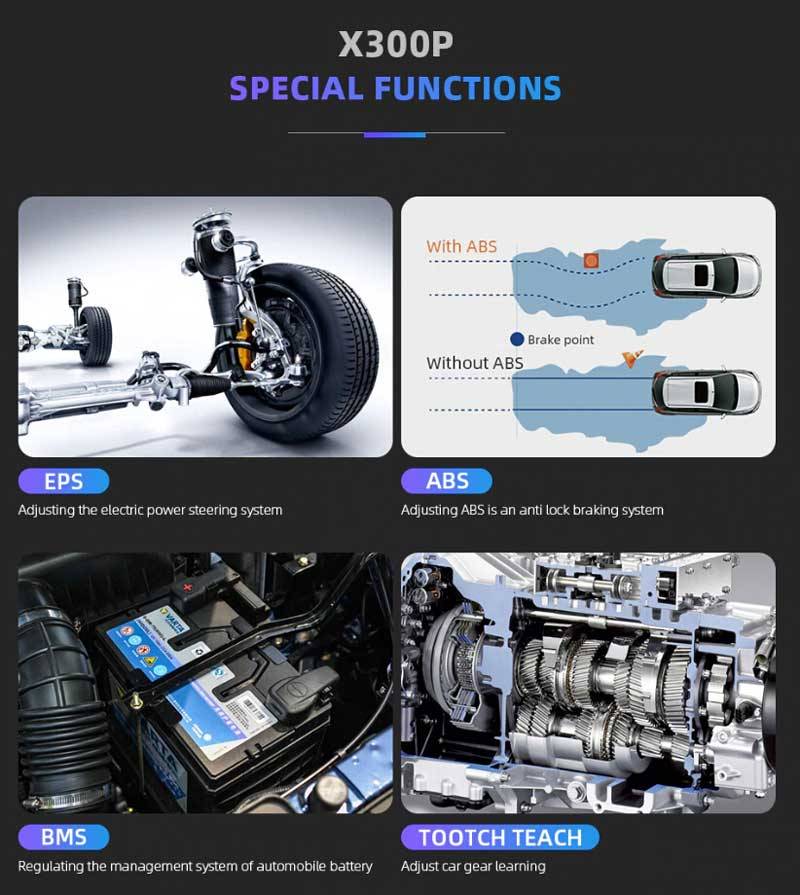The XTool X300P is a powerful diagnostic device for special vehicle functions. Includes ABS bleed, battery replacement, reset service indicator, EPB electronic brake replacement brake pad, OBD II engine diagnostic, reset tire pressure warning light, adjust electronic steering, learn how to teeth, reset throttle body, etc.