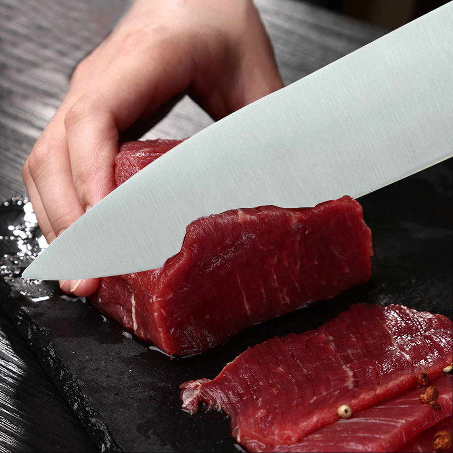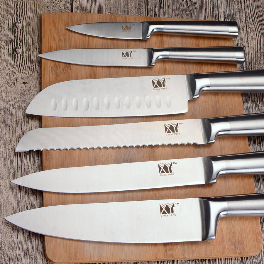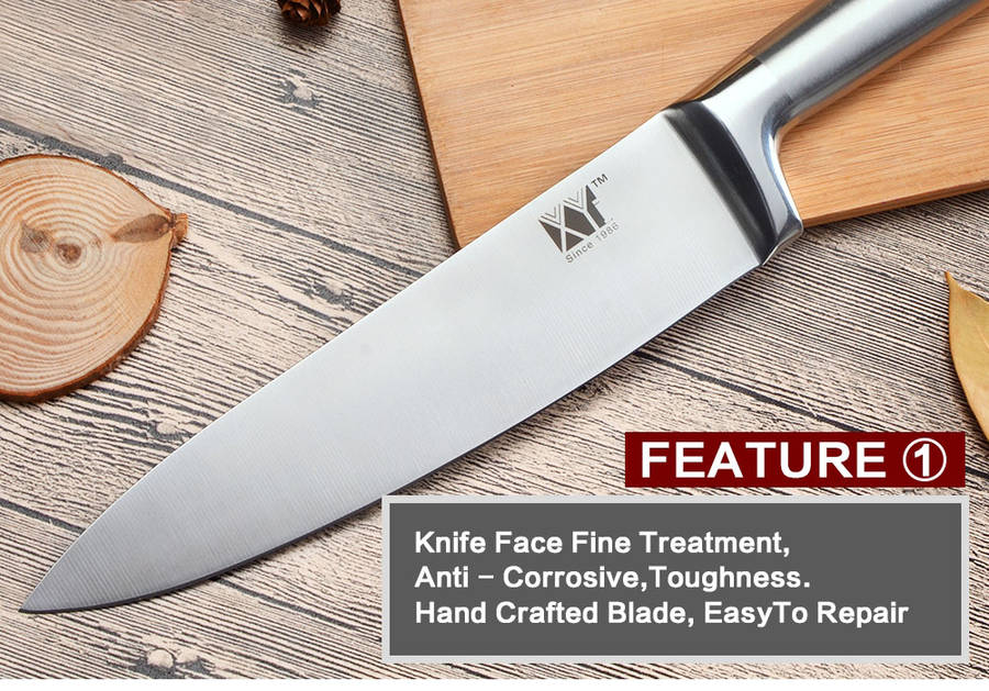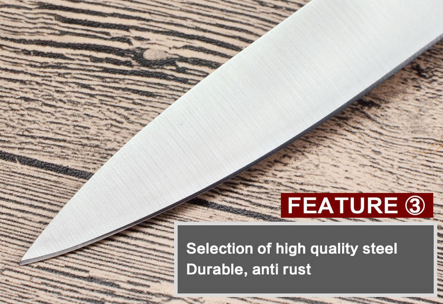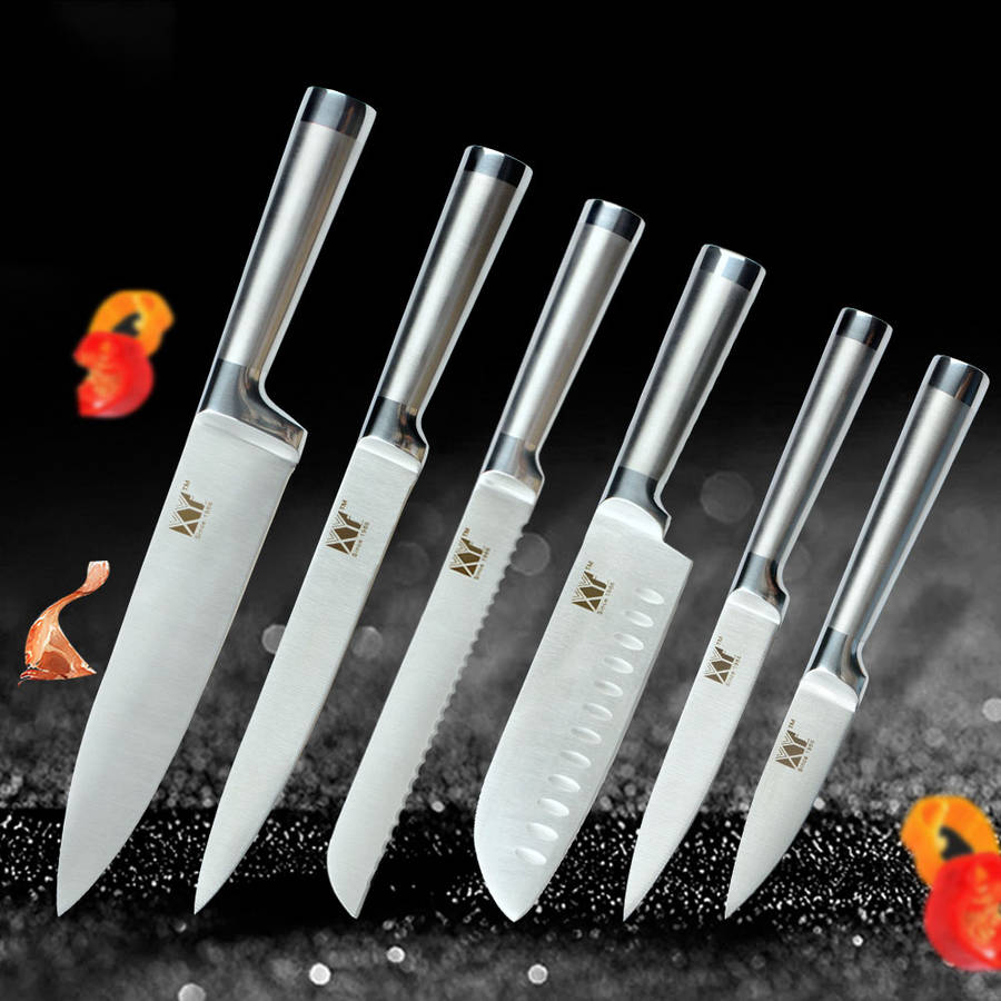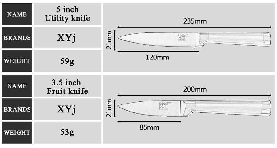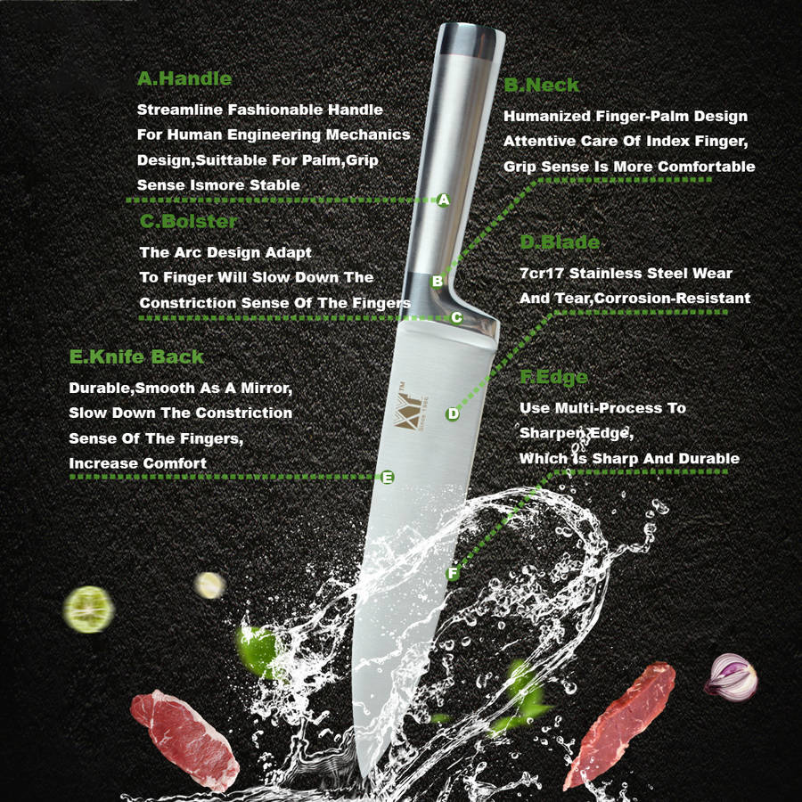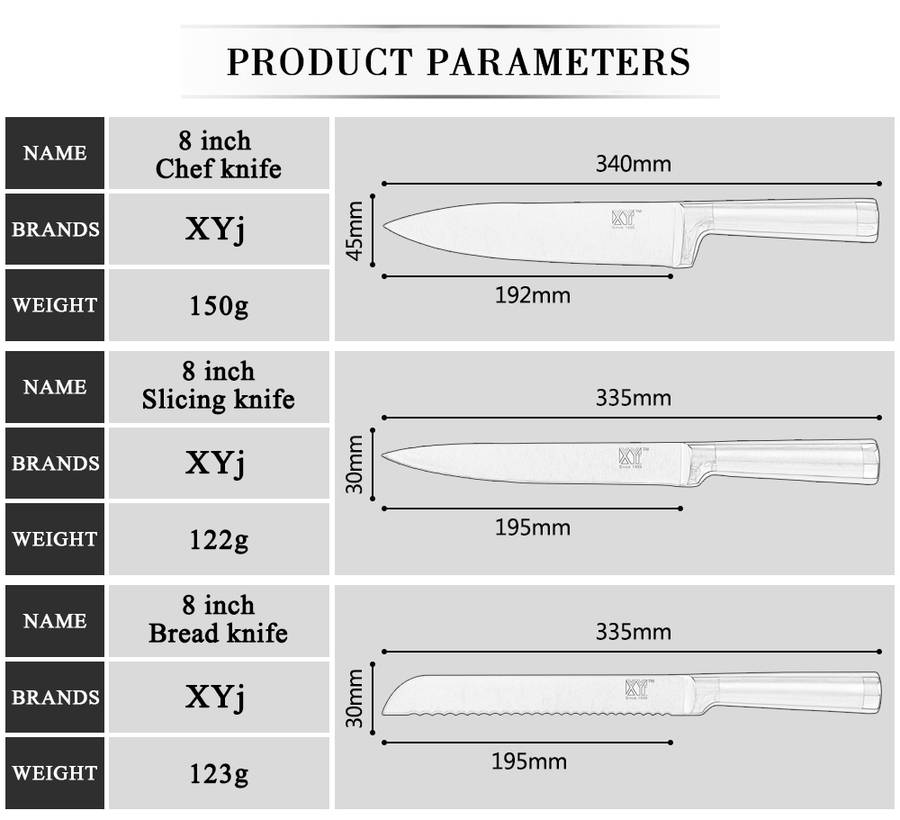 | Size | 8 Inch Chef Knife 8 Inch Slicing Knife 8 Inch Bread Knife 7 Inch Santoku knife 5 Inch Utility Knife 3.5 Inch Fruit Knife |