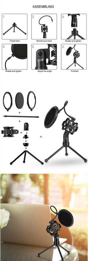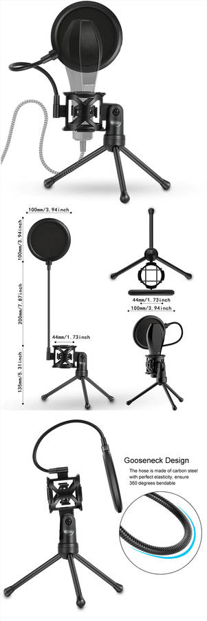 Exclusive appearance patent, simple and stylish High quality ABS material, tough and durable Perfect combination of shockproof tripod and blowout preventer, recording more real and clear The gooseneck flexible hose adopts carbon steel material, can withstand more than 1W bending test, and can be adjusted at any angle Anti-nozzle cover adopts double layer mesh design, double noise reduction Microphone stand adjustable 180 degrees Detachable, foldable, easy to carry and carry Position of silicone ring can be adjusted according to microphone handle specifications
