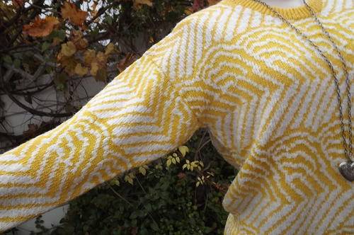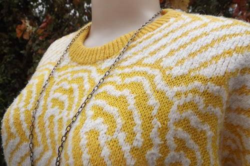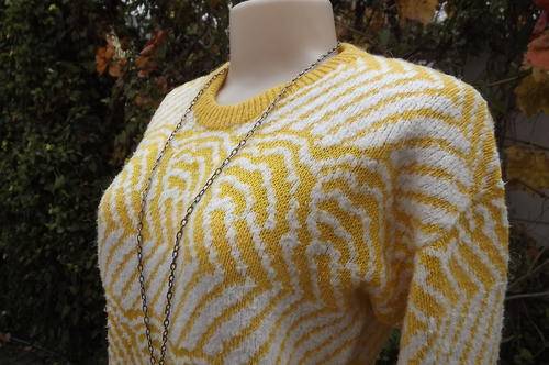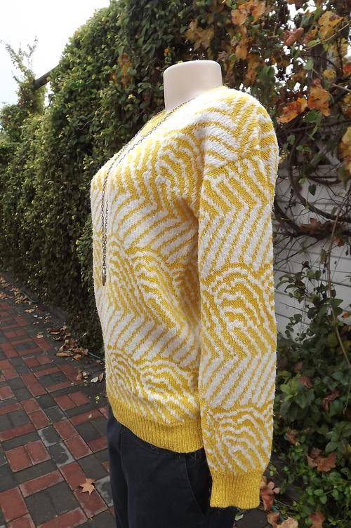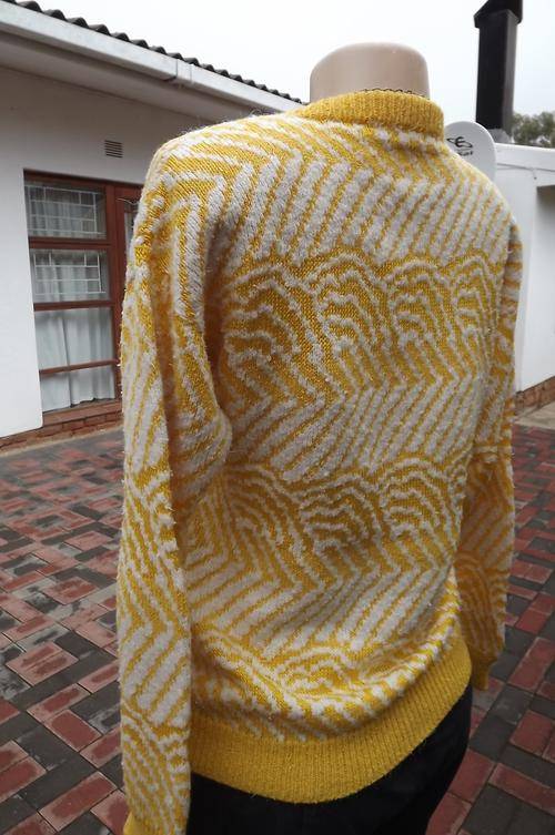 Yellow and white patterned knitted acrylic sweater in size 36/12.Used but good for everyday wear