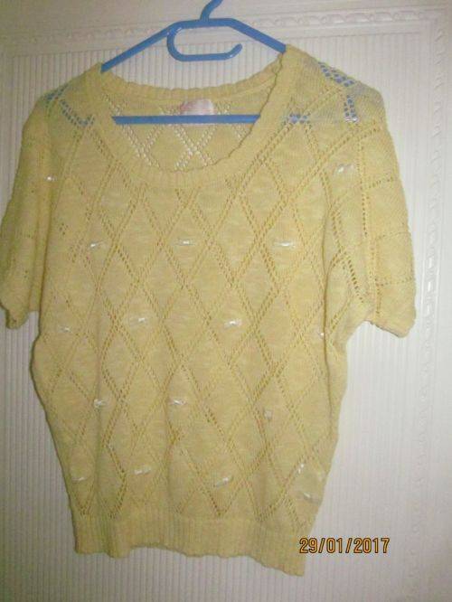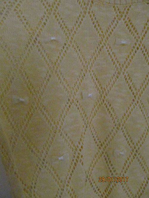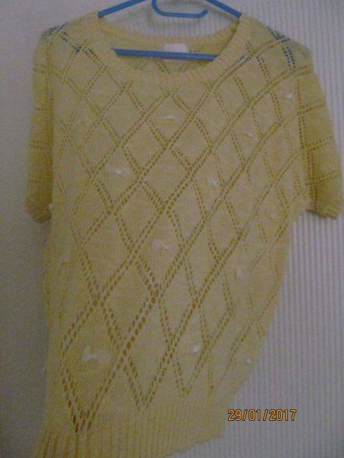 This Beautiful Casual wear item has short sleeves and is versatile with the items you choose to wear it with. A lovely Diamond pattern has been used in the knit and refreshing yellow bows adorn the front