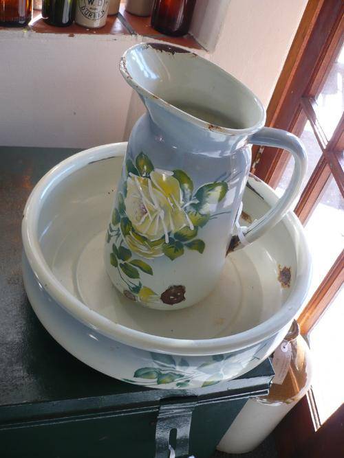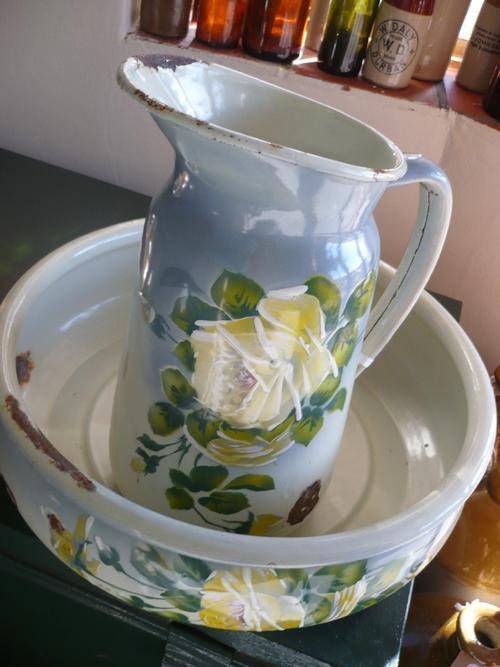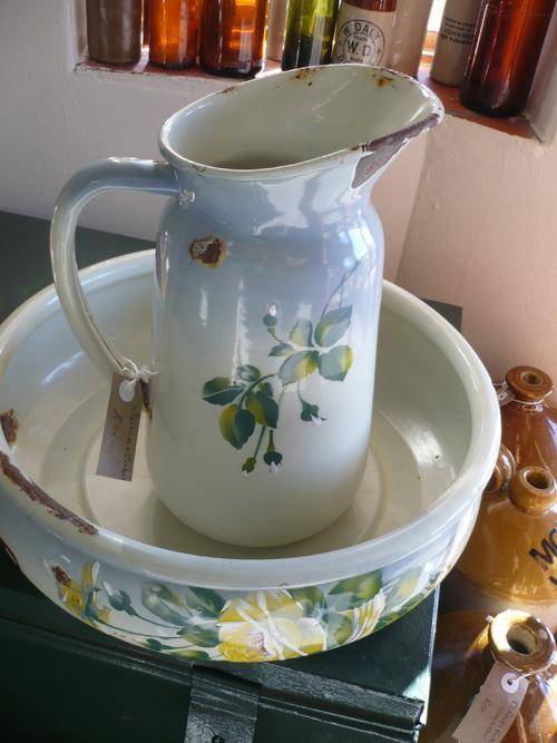 MARKED YELLOW ROSE PITCHER AND BASIN ENAMEL SET . PLEASE NOTE THE NORMAL RUST AND WEAR AND TEAR ON OLD ENAMEL HEIGHT OF PICHER 34 CM . FLOWER DETAIL IS SUPRESSED AND THE JUG HOLD WATER .POSTAGE R65 DUE TO THE WEIGHT .