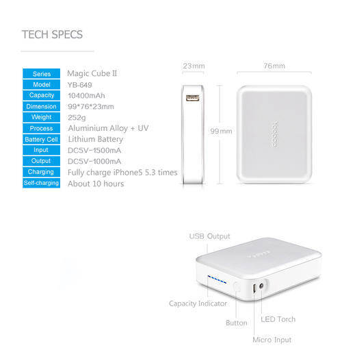 Set contains: - YB649 Magic Cube II Power bank (10,400mAh) - Five Switch Connector: V8 Micro, iPod switch Micro, Nokia switch micro, PSP switch micro, Mini switch micro - Micro USB cable - User manual - Pouch