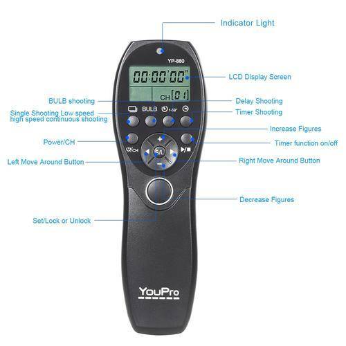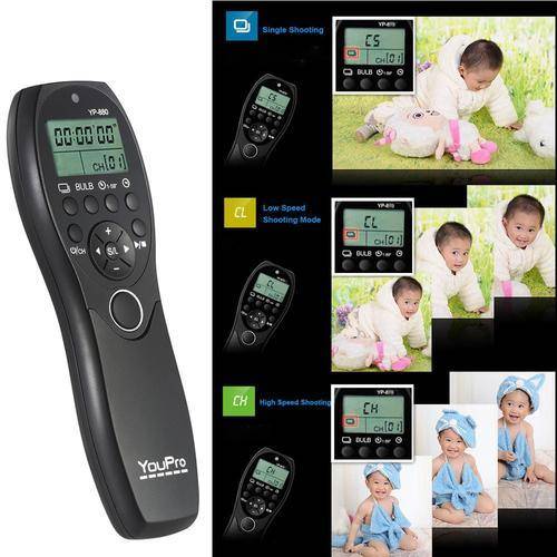 YouPro YP-880 camera wired shutter release remote control supports single shooting, low speed and high speed continuous shooting, Bulb shooting, delay shooting and timing shooting, can meet your different shooting requirement.