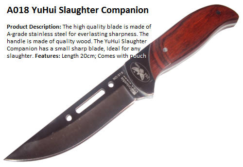 The high quality blade is made of A-grade stainless steel for everlasting sharpness. The handle is made of quality wood. The YuHui Slaughter Companion has a small sharp blade, ideal for hunting &/or slaughtering. Handle length: 95mm; Blade length: 95mm & Total Knife Length: 190mm.