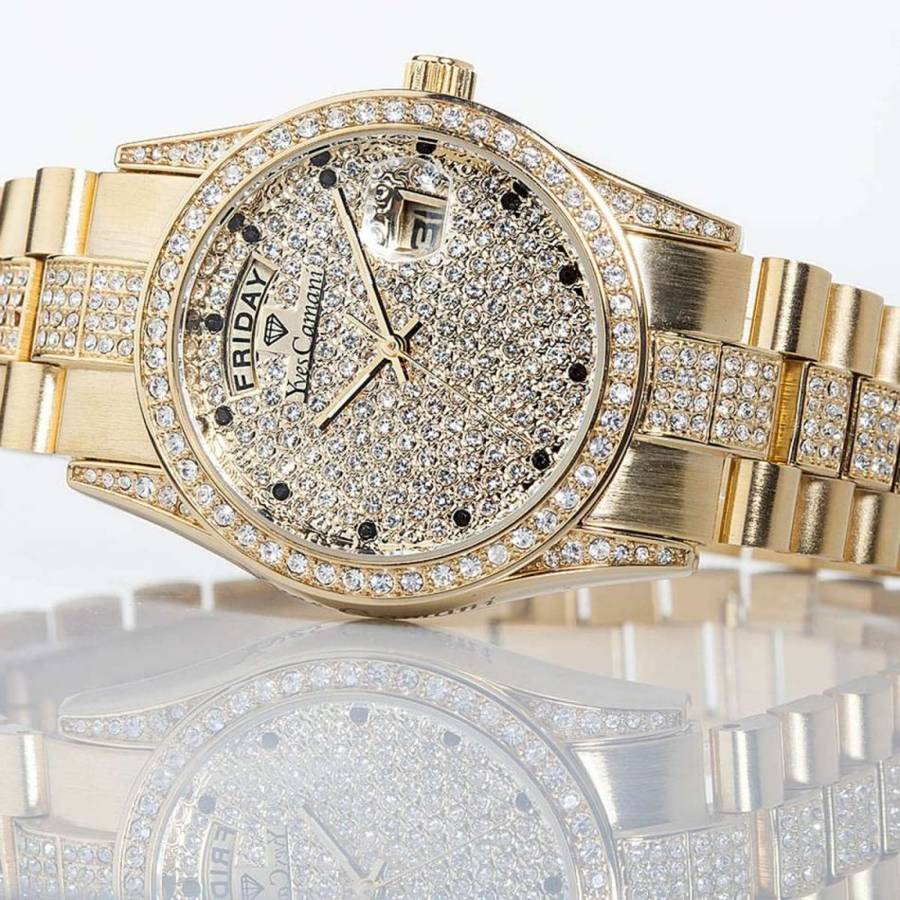 **Brand New**YVES CAMANI Women's Archimedes Gold pl. Cubic Zirconia and Sugar Dial Day/Date Watch BRAND NEW official SA