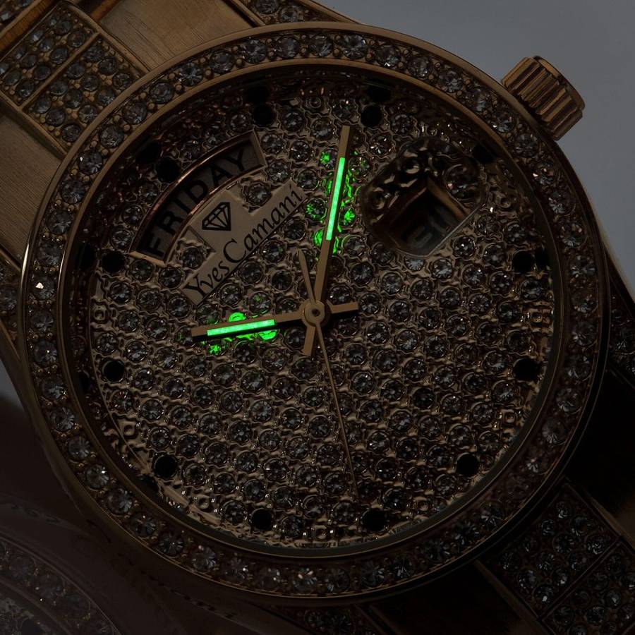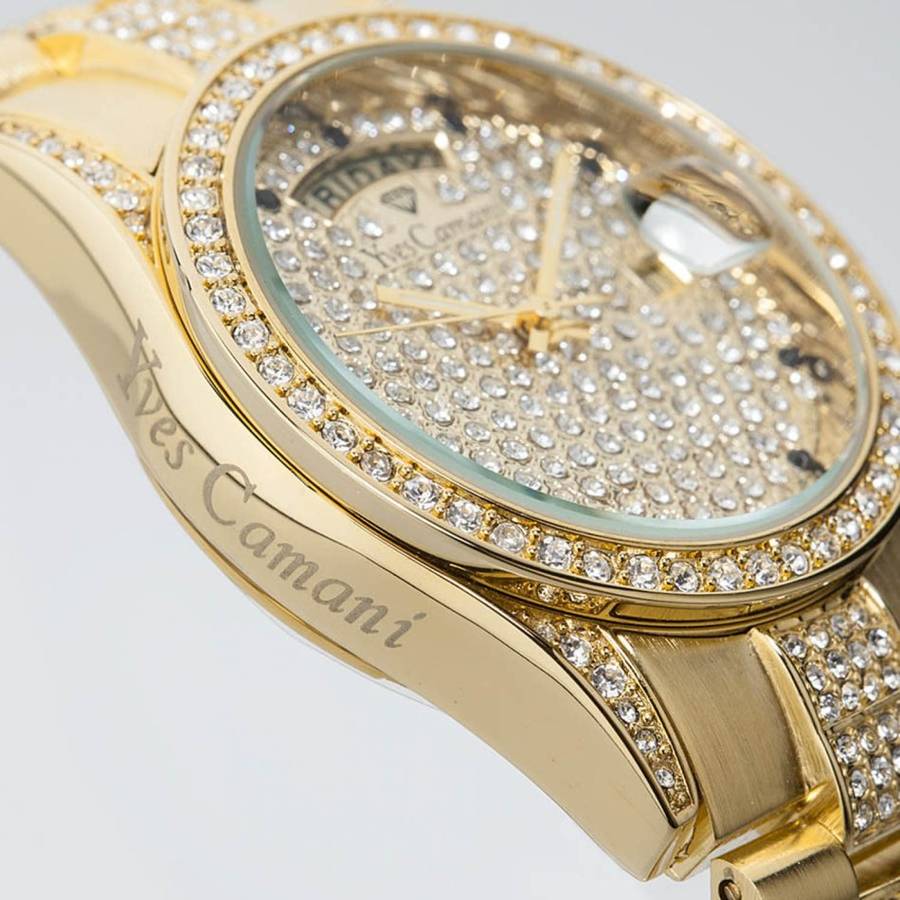 Yves Camani accomplished the quest for perfect balance between aesthetics, structure and function. They create timepieces of artful precision and beauty, thus laying the foundations of the Yves Camani watch making tradition. Set with countless cubic zirkonia crystals on both the casing and bracelet, the Tiberius is part watch, part captivating adornment. And in the midst of all this splendour, the dial displays both date and day of the week. The high-grade stainless steel casing houses a quality quartz movement. 34mm case diameter.
