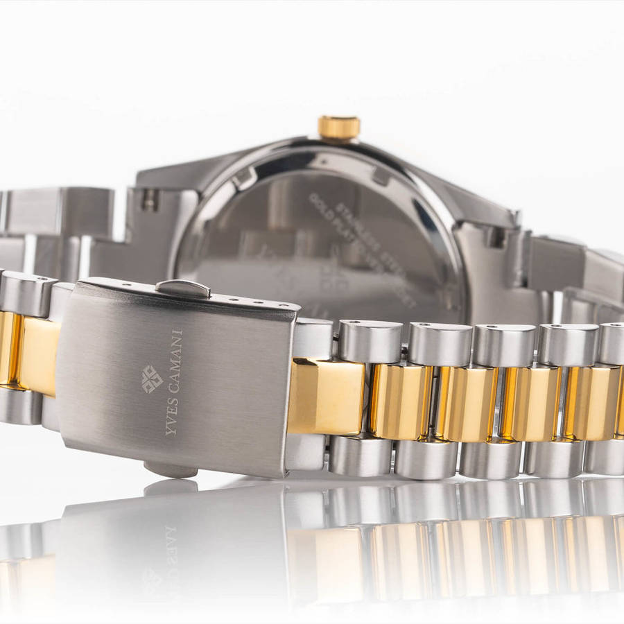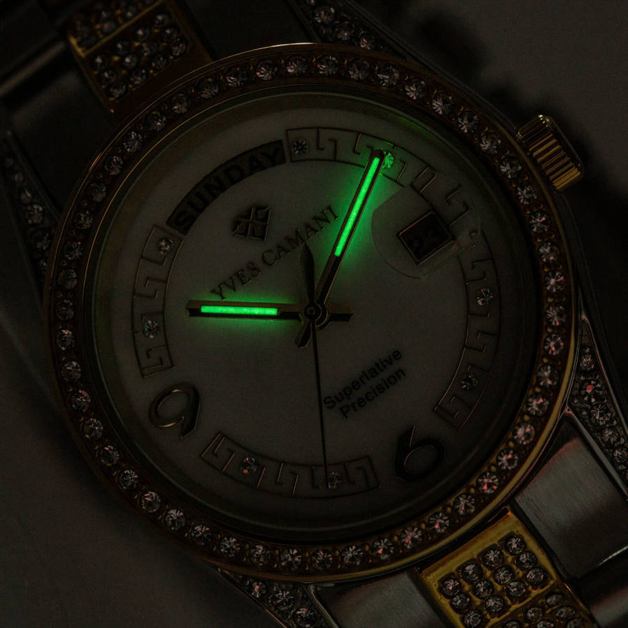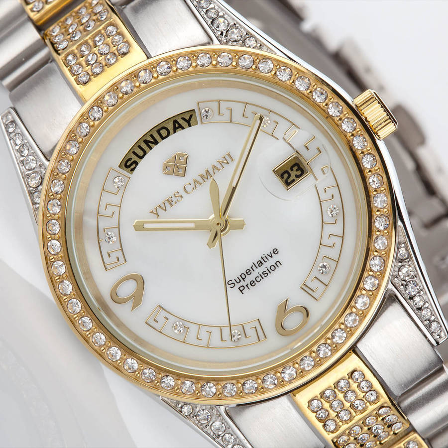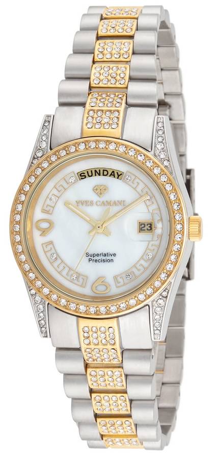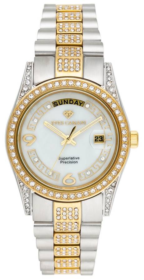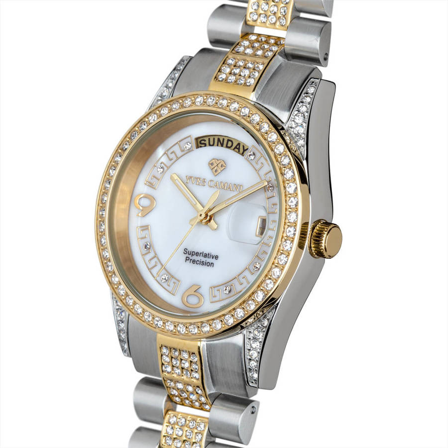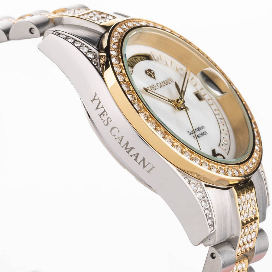 Yves Camani accomplished the quest for perfect balance between aesthetics, structure and function. They create timepieces of artful precision and beauty, thus laying the foundations of the Yves Camani watch making tradition. Set with countless cubic zirkonia crystals on both the casing and bracelet, the Tiberius is part watch, part captivating adornment. And in the midst of all this splendour, the dial displays both date and day of the week. The high-grade stainless steel casing houses a quality quartz movement. 34mm case diameter. Not suitable for water exposure or water use. Avoid all water.
