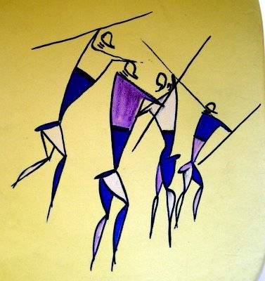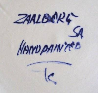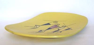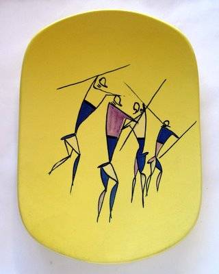 A Zaalberg pottery plate in a rectangular shape, painted with a bushman-like depiction of hunters.
