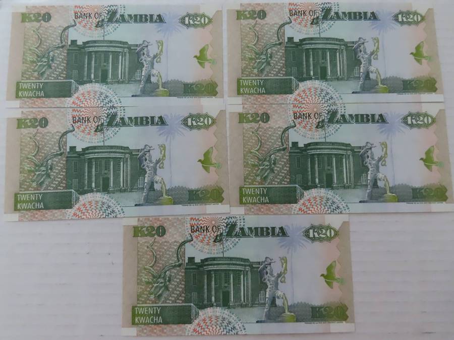 Here we have Zambia - 1992 - 5 X 20 Dollar Notes IN Sequence UNC