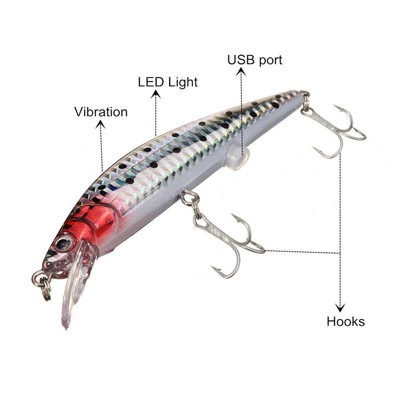 Features: --Not easy to be broken, can withstand heavy fish. --Anti-corrosion, durable and practical characters. --The quality is very good, it experienced precision processing. --Rechargeable lures,can be charged in minutes by USB port. --Flashing LED light in the dark, vibrate in the water. --Life-like swimming actions in water,easy to fish by this item. --Smooth and rapid diving action.