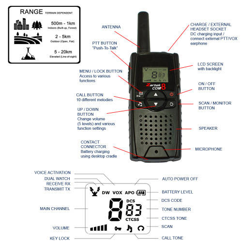 The Zartek handheld, licence-free radio is a multifunctional wonder. At credit card size, and weighing in at a meagre 67 grams, this portable communication device with rubber protective casing doubles as a handy baby monitor and FM radio tuner. Kit yourself out for work or play.