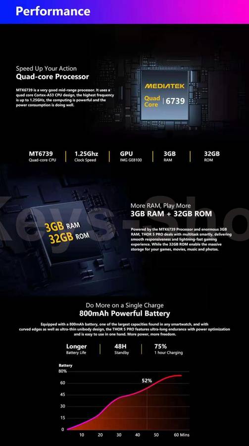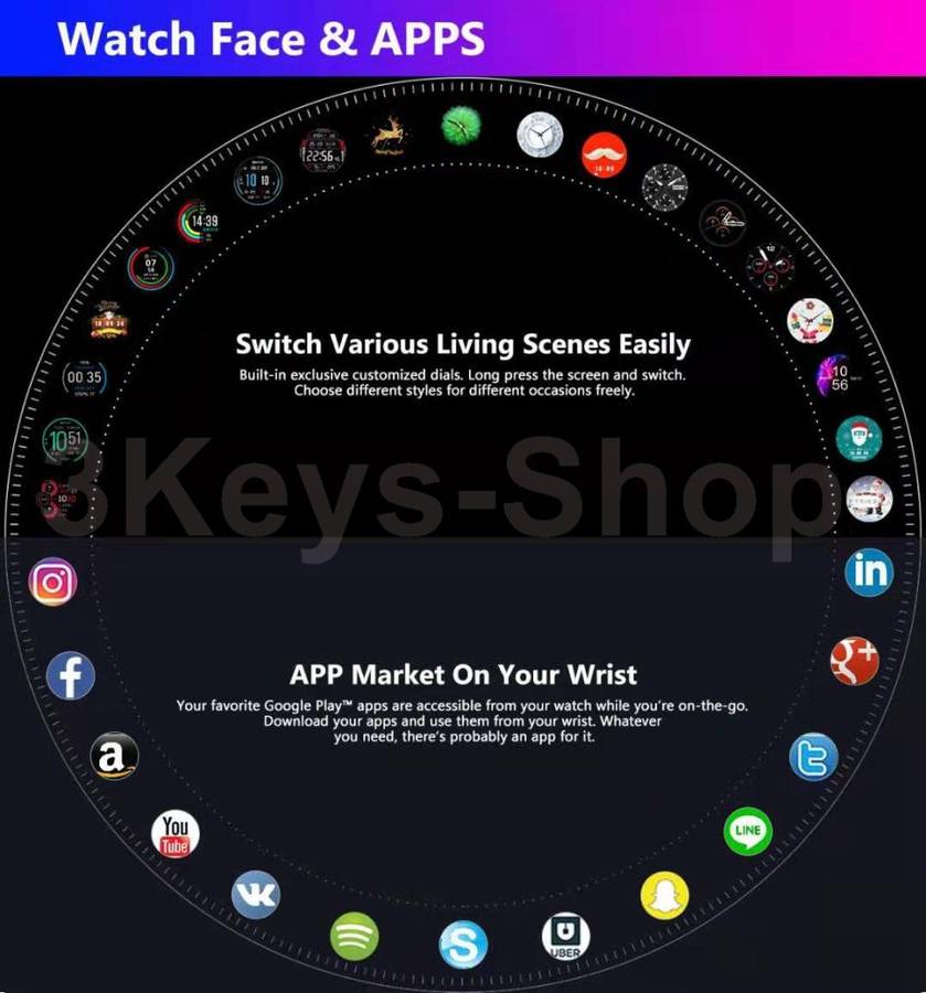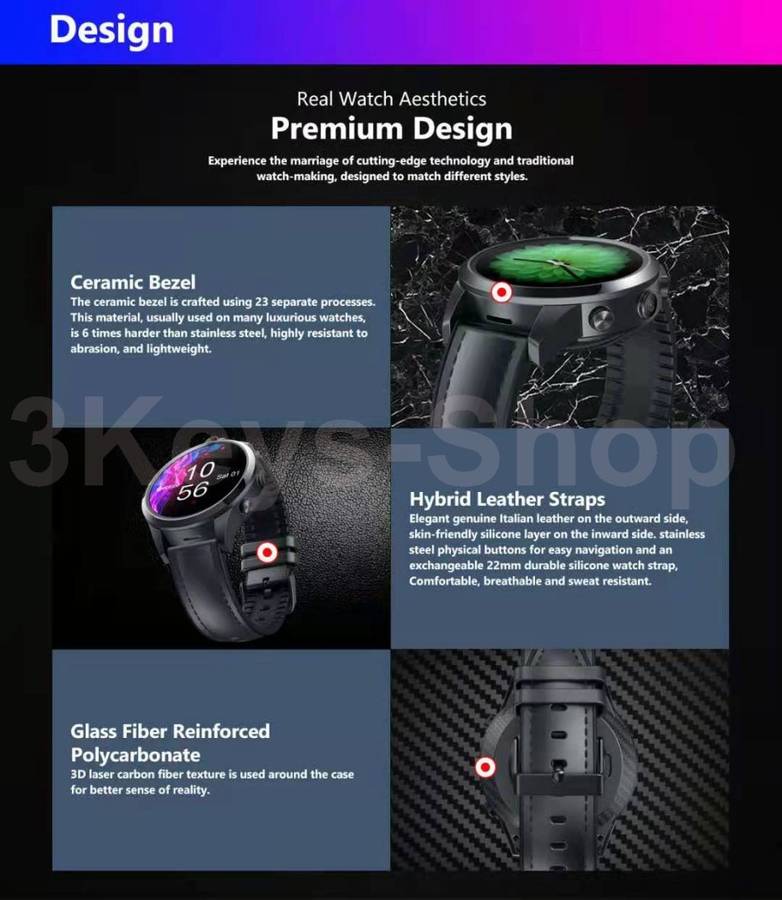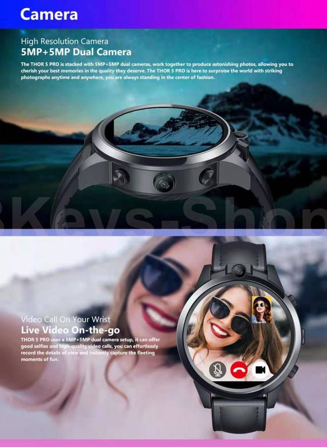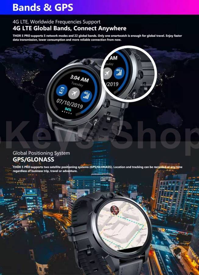 Functions: 4G Network(Global Bands), GPS/GLONASS, Google Play, Voice Search, Offline Music, WiFi, Weather, Clock Faces for Any Occasion, Apps, Clock faces & Notifications, Phonebook, Alarm, BT, Browser, Calendar, Camera, E-book, MP3, MP4, Heart rate monitor, Pedometer, Call Reminder, Remote Music, Message Notification, Remote Camera, Answer Call, Dial Call.
