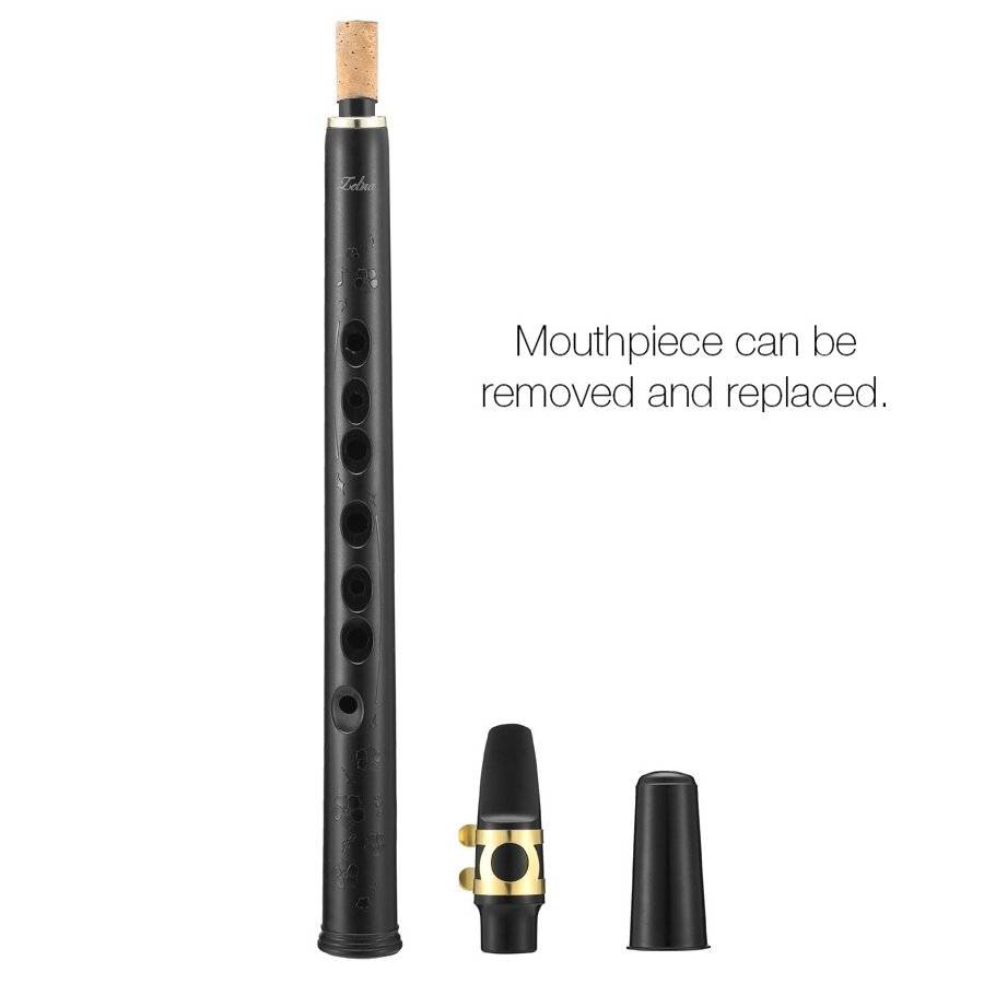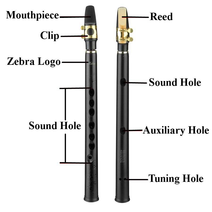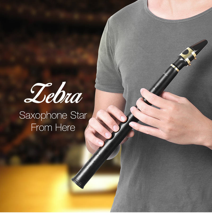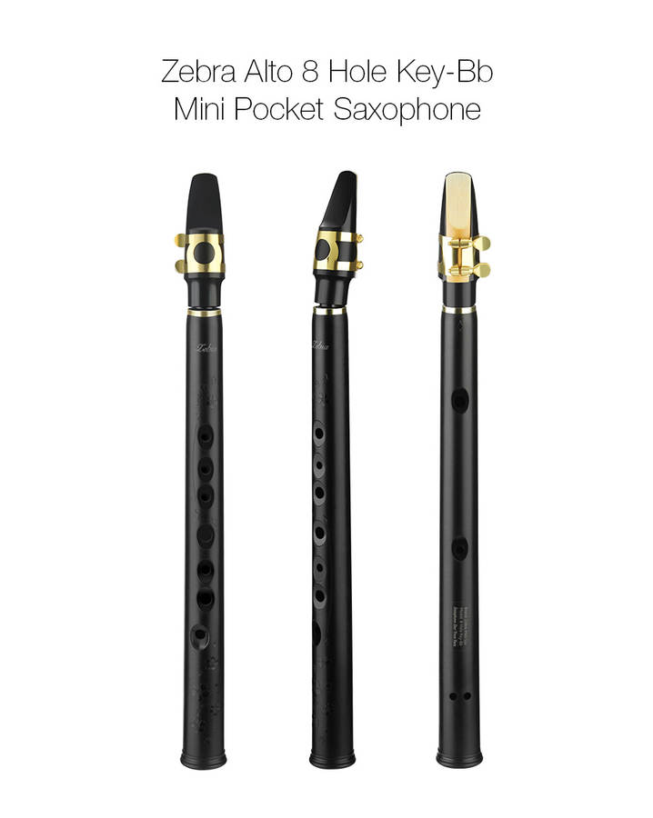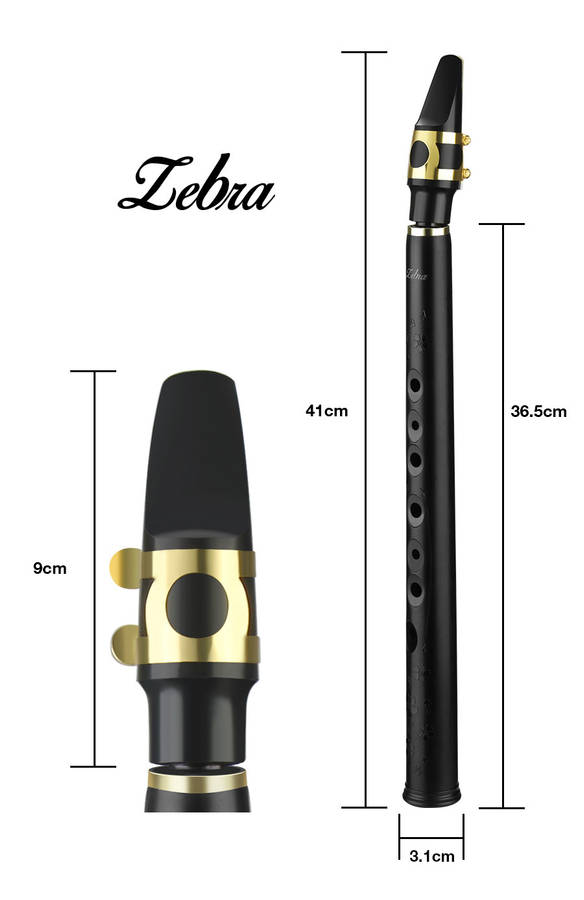 Name: Zebra™Key-Bb Pocket Saxophone with Alto Mouthpiece Brand: Zebra Color: Black Hole: 8 Holes Tone: Key-Bb with Alto Mouthpiece Material: ABS Resin Finish: Matte Surface Weight: About 224g Size: About 41cm*3.1cm(L*D) Usage: For any music amateur and professional person.