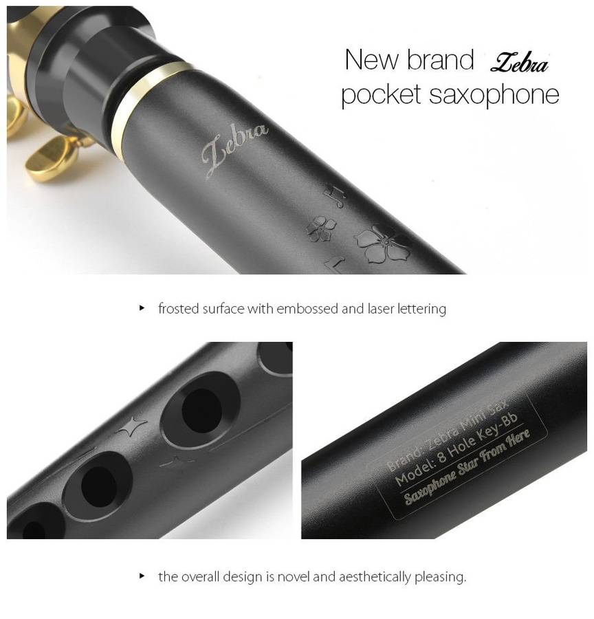 * New Brand Zebra™, frosted surface with embossed. * Made of solid ABS and can be used for a long time. * Cheap price, mini and lightweight, convenient to carry. * It can change all alto mouthpiece you want. * The pocket saxophone is a necessity for any music amateur and professional person. * Its volume is smaller than the real saxophone, will not affect the others when you practice. * The pocket sax is Key-Bb with alto mouthpiece, easy to play and its tone very close to a real saxophone. * It has embossed and laser lettering on pipe body, the overall design is novel and aesthetically pleasing.