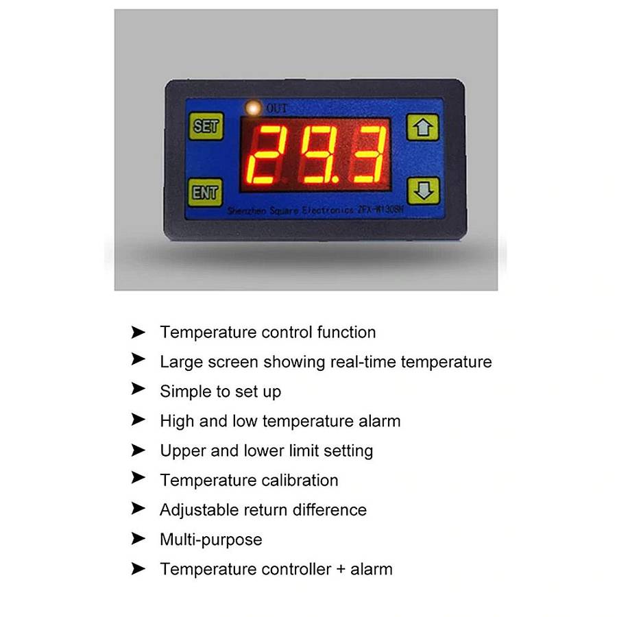 Features: ? - Easy to use, plug and play. Accurate measurement, alarm immediately after reaching alarm temperature, with alarm bell. - High decibel alarm. - LEDs sound and light integrated. - Large screen displays real-time temperature, high and low temperature alarm, upper/lower limit setting. - When the alarm temperature is exceeded, press any key on the thermostat to exit, effectively remove the continued alarm trouble. - This temperature control alarm uses M6 screw hole, easy installation. - The power supply end adopts 2 inserted 1-meter wire, while the temperature sensing wire adopts 1.5-meter high temperature wire. ? Specifications: ? Temperature control range: -5-300 degree Temperature control accuracy: 0.1 degree Screen color: Red Output capacity: 10A relay Sensor: 1M NTC probe line B3435 10K Working voltage: 110-220V Plug Type: US Plug Colour:White + red Material:ABS Size:115x94x230 mm ? Package Included: ? 1 x Temperature Alarm with US Plug 1 x Sensor Probe? ?