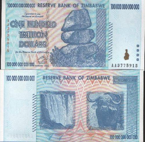 Zimbabwe 100 trillion Dollars uncirculated AA numbered x 5 notes