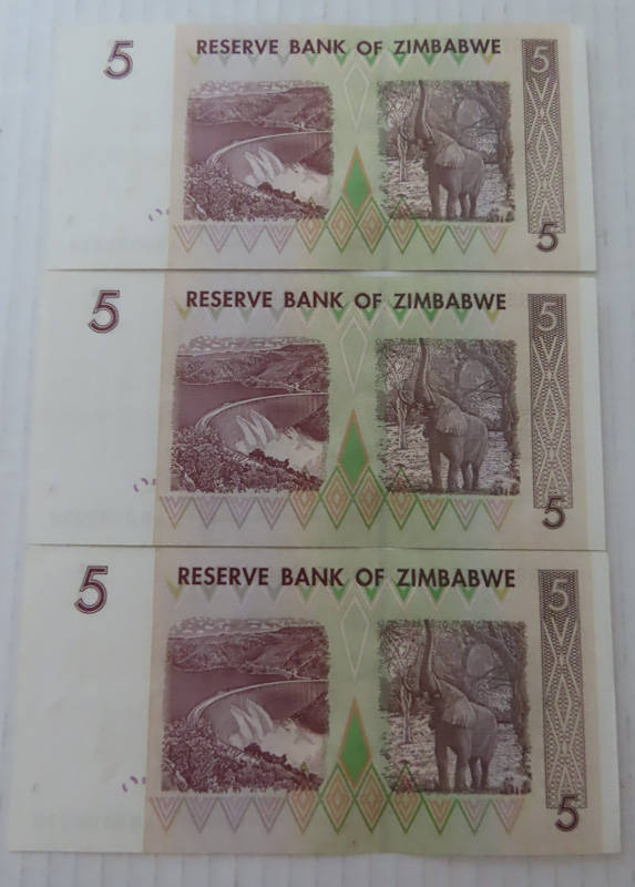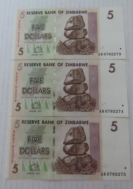 Here we have Zimbabwe - 2007 - 3 X 5 Dollar Notes in Sequence UNC
