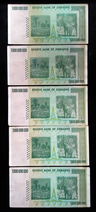 ZIMBABWE 2008 ONE BILLION DOLLARS AA PREFIX NOTES (5 NOTES)