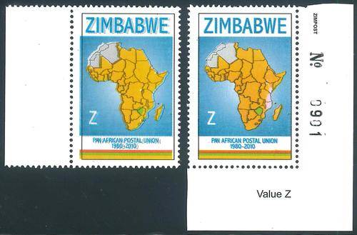 Zimbabwe 2010 "Anniversary of the Pan - African Postal Union" left marginal single (Z) stamp (SG 1313) with the Variety "Impressive Shift of blue colour to the left". A normal corner stamp is included for comparison. Both stamps are in unmounted mint condition (MNH).