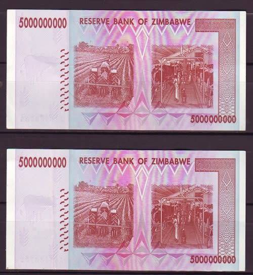 Zimbabwe 5 Billion Dollar Notes - 2 Notes in Sequence