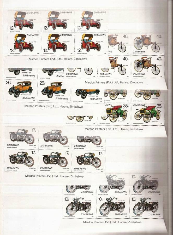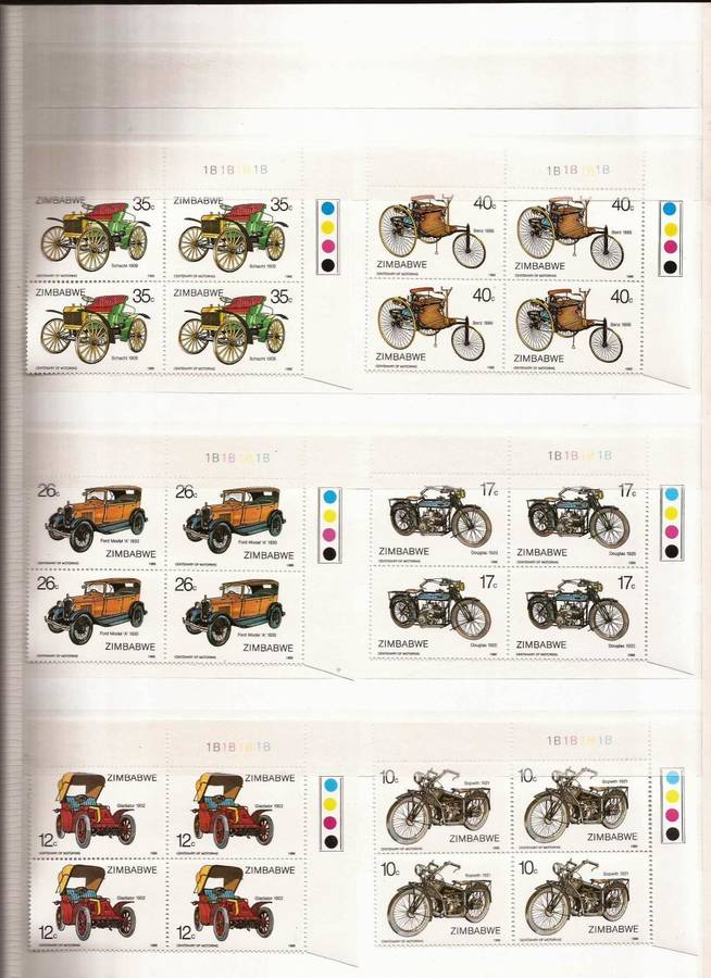 ZIMBABWE - CENTENARY OF MOTORING - COMPLETE SET IN MNH IMPRINT BLOCKS OF 6 AND MNH CONTROL BLOCKS OF 4