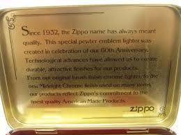 The 60th Anniversary commemorative features a midnight chrome lighter with a special 60th anniversary pewter emblem. The lighter is packaged in a hinged collectors tin with the 60th anniversary logo on the top of the lid, and a message ensuring Zippo's continued commitment to quality on the inside.